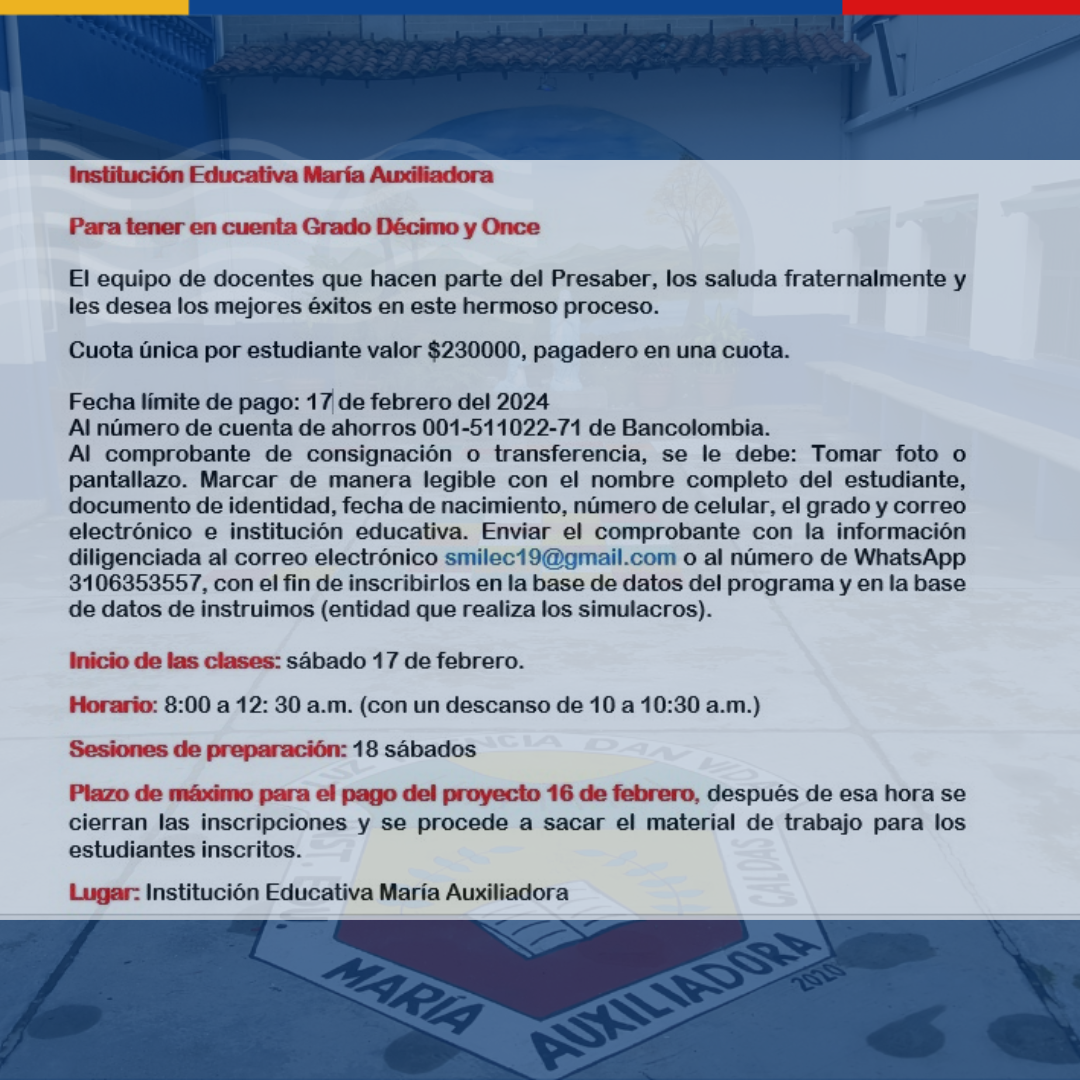 - Cuota única por estudiante valor $230.000, pagadero en una cuota.