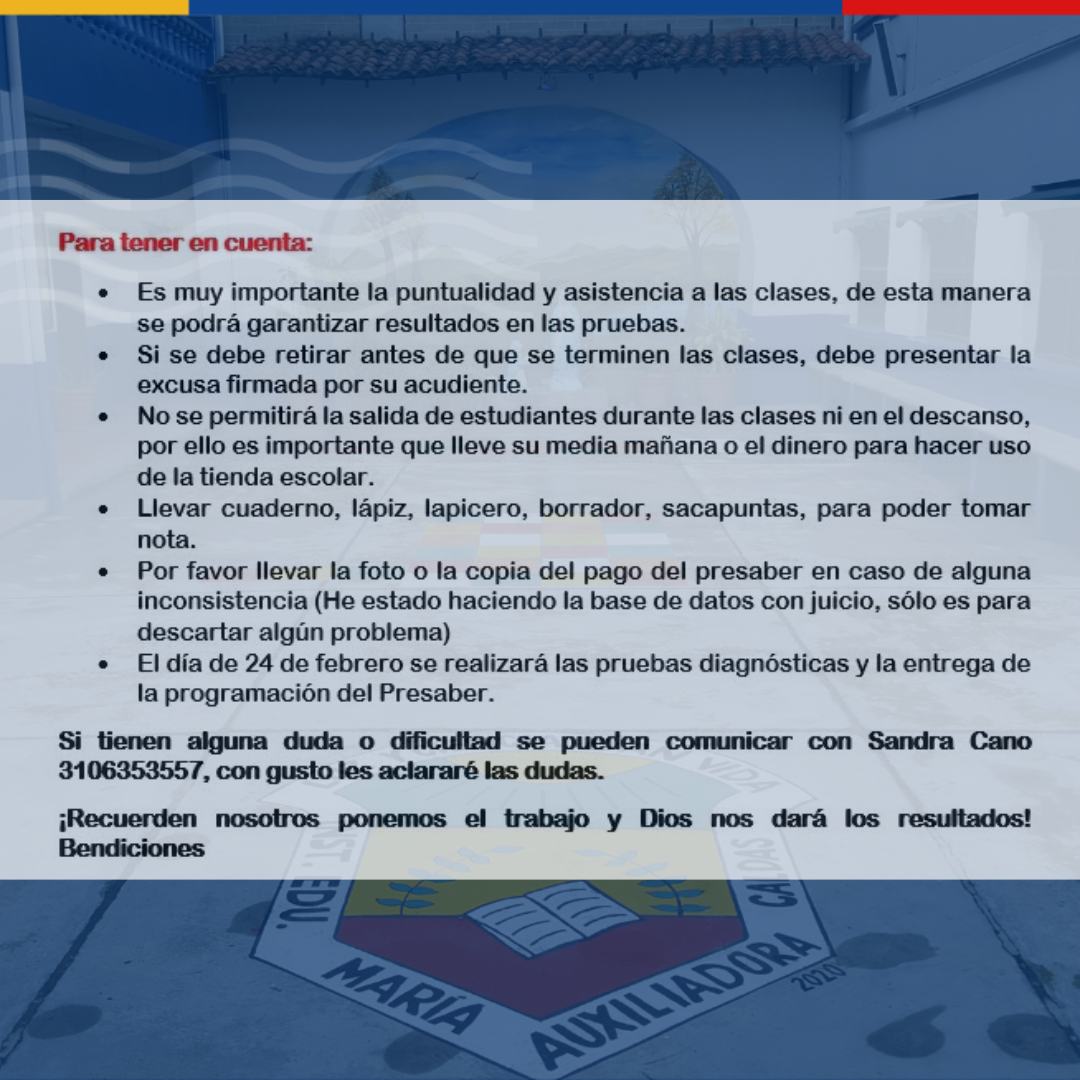- El día 24 de febrero se realizará las pruebas diagnósticas y la entrega de la programación del Pre-saber.